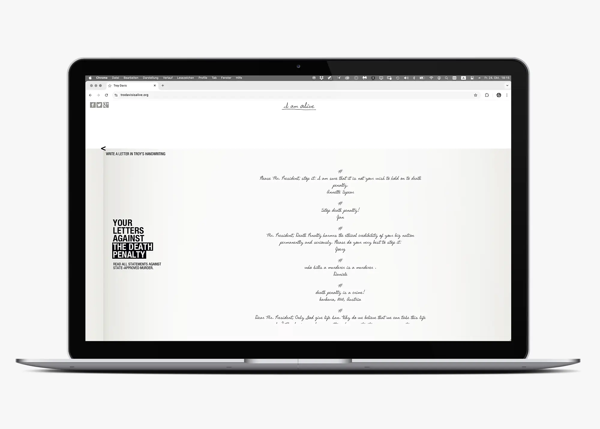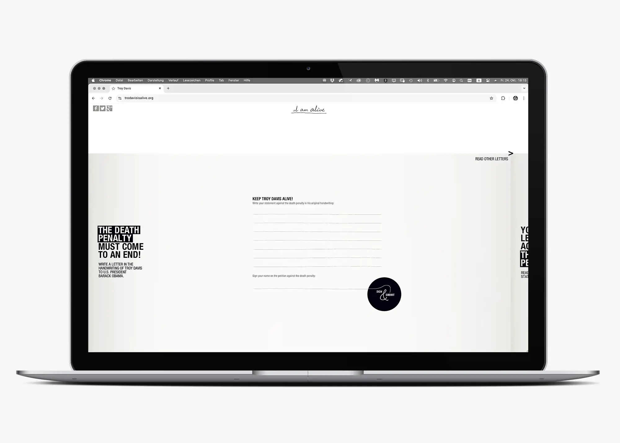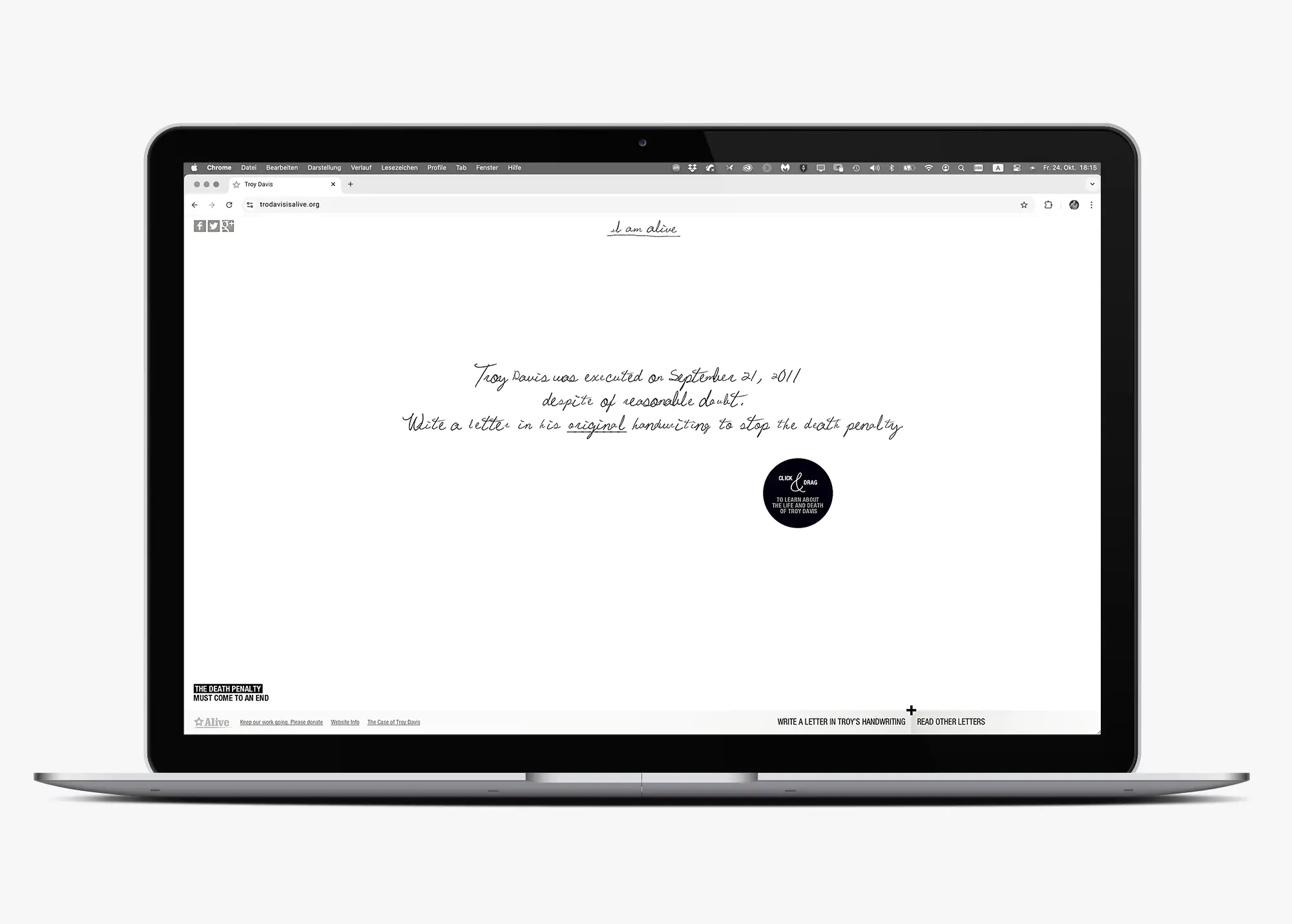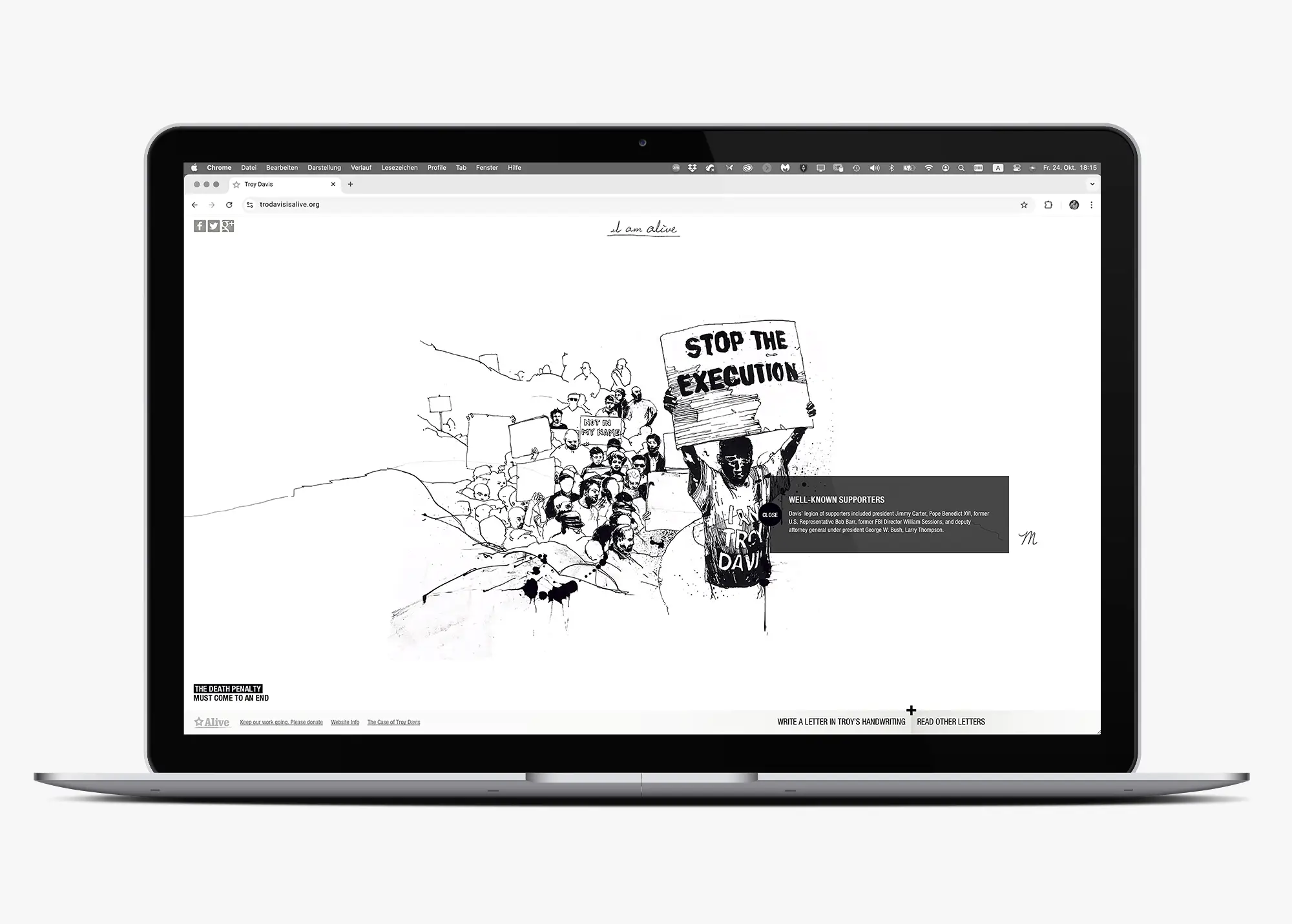 Die Kampagne wurde von Serviceplan Campaign unter der kreativen Führung von Cosimo Möller für den Verein Alive aus Bocholt entwickelt und umgesetzt. Bei Alive zeichnete sich Petra Thompson, Gründerin und Vorstandsvorsitzende von Alive, verantwortlich. Im Auftrag von Serviceplan Campaign entwickelte ich mit STUDIO SKRABAL das Schriftdesign der Kampagne: Die Handschrift von Troy Davis wurde digitalisiert und zu einem voll funktionsfähigen Font ausgebaut, der als zentrales visuelles Element der Kommunikation dient.